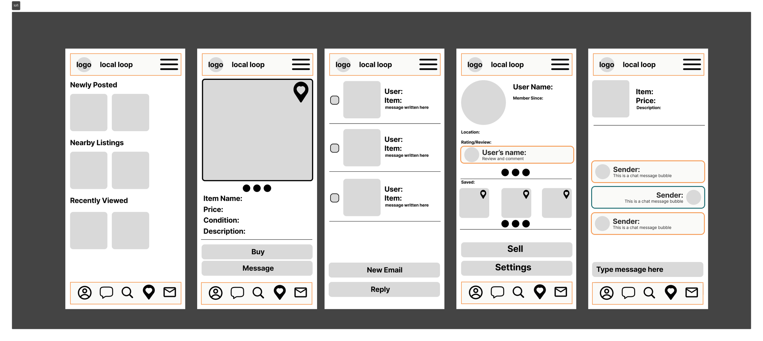 Early wireframes focused on organizing the marketplace feed and item detail pages.